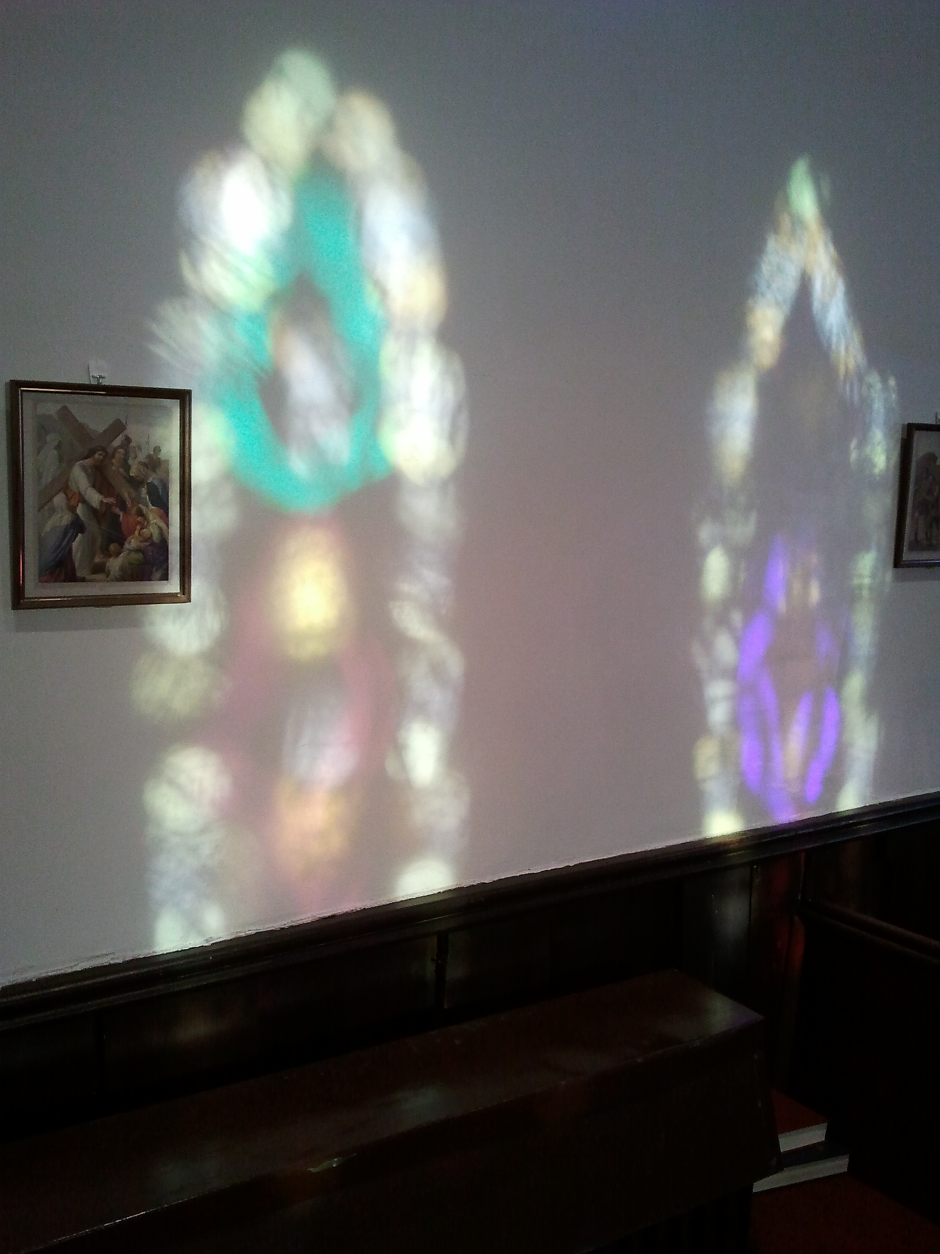 We turn and see a lovely sight: the sun streaming through the stained glass illuminates the wall opposite with vibrant color.